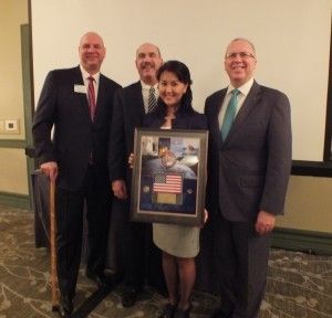 stand with a framed US flag flown [in space] aboard Orion Exploration Flight Test -1 that Mayer presented to chamber leadership.